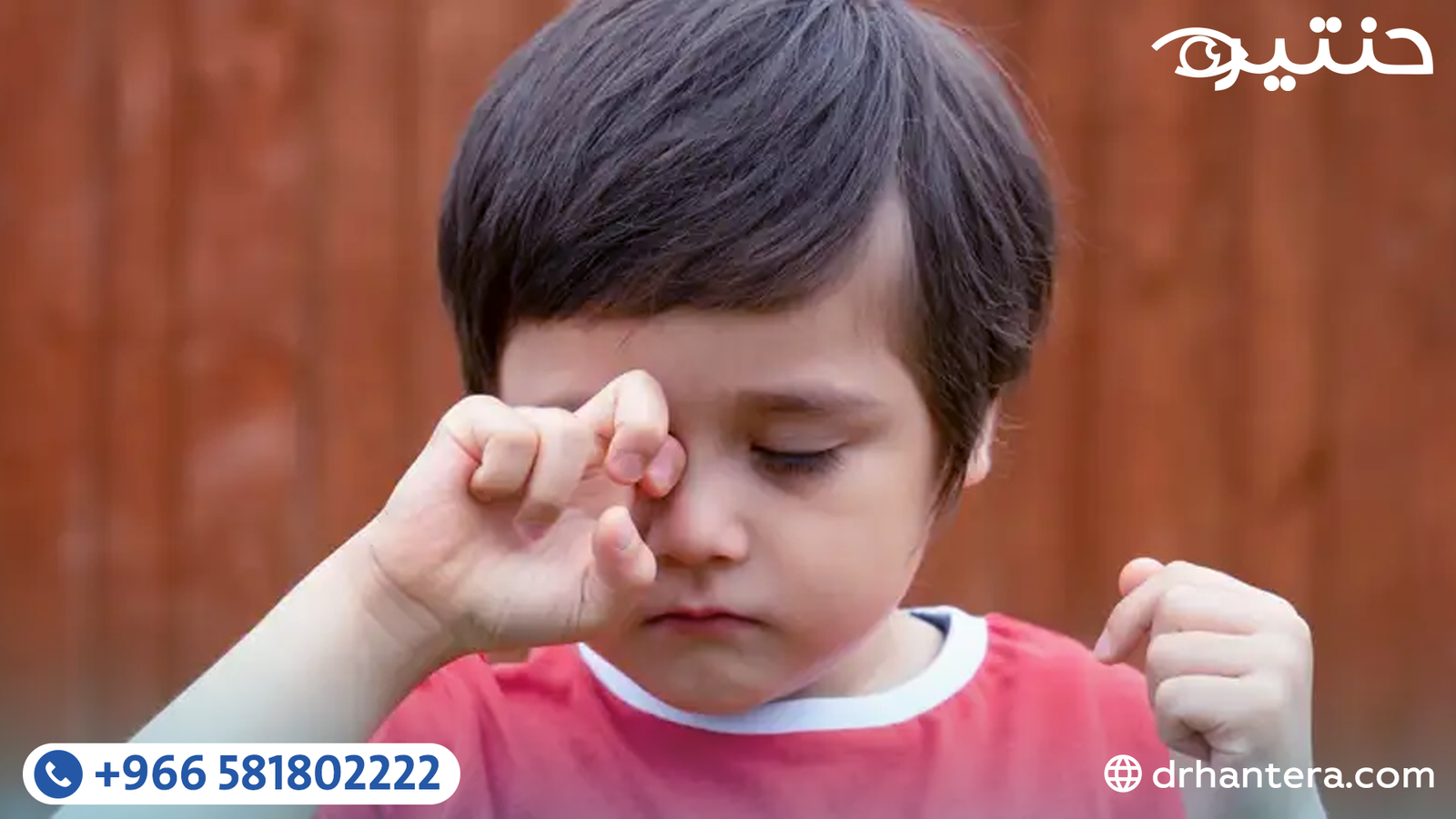 حكة قوية جداً تجعل الطفل يفرك عينه حتى الاحمرار (حساسية موسمية).