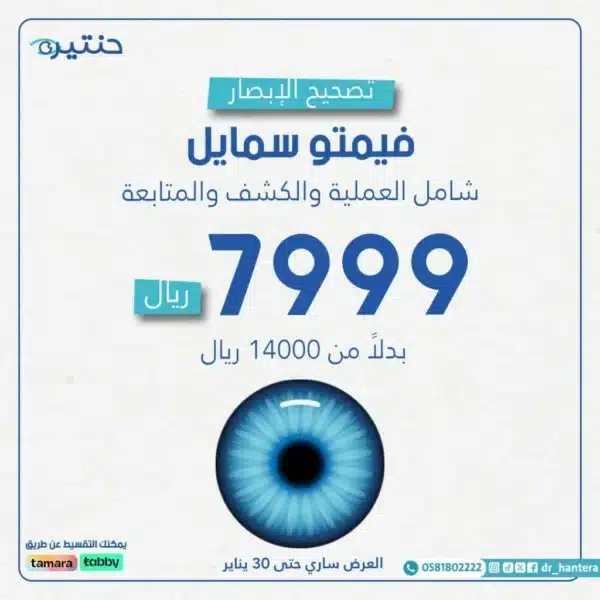 استمتع برؤية مثالية تحت إشراف الاستشاري د. محمد حنتيرة، الذي يقدم لك أحدث تقنية عالمية لتصحيح النظر بدون ألم وبفترة نقاهة قياسية. السعر 7999 ريال (بدلاً من 14000 ريال)